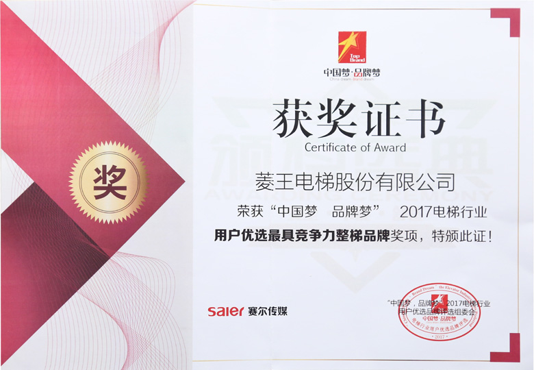 此奖项是为产品质量、服务水平、技术含量、商业信誉、经营业绩等方面表现突出,市场占有率高,在细分领域具有强大竞争优势和领导地位的整梯制造企业量身定做。经过数月来一系列的评选环节——调查问卷投票,专家评审团、媒体投票,网络投票等,菱王电梯凭借自身品牌实力,获得了群众、专家代表团、业内人士的广泛认可。