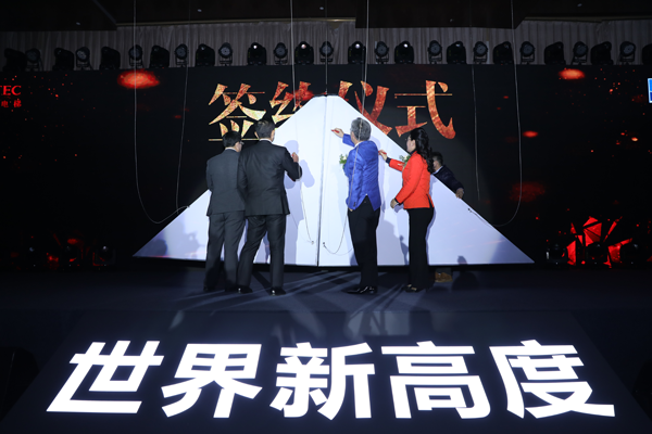 签约仪式设计梦幻绚丽,一片雪花从天而降,落地组合成的雪山造型让人对新雪国穿山电梯未来运行其中的主峰充满期待。