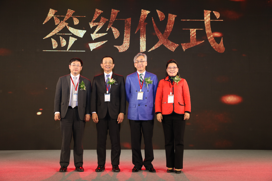 华升富士达电梯有限公司、上海华升富士达扶梯有限公司董事长刘贤福,富士达株式会社社长内山高一,新雪国创始人、终身荣誉主席孙寅贵,新雪国控股有限公司董事局主席周洄(从左至右)