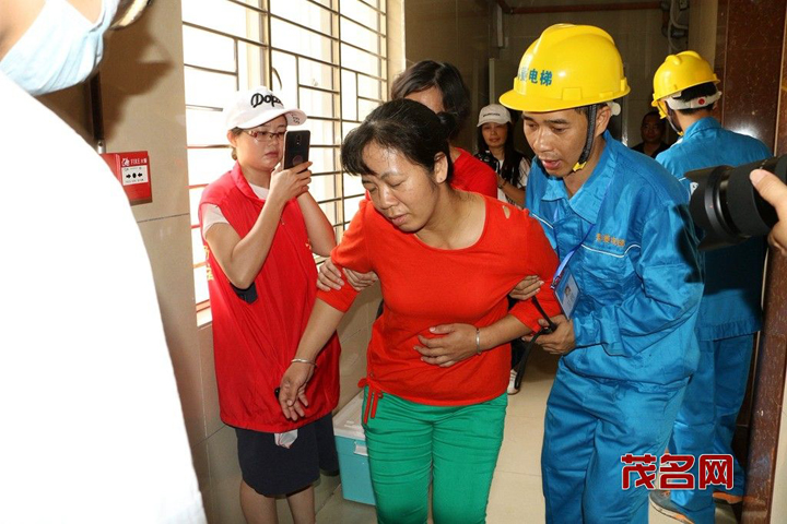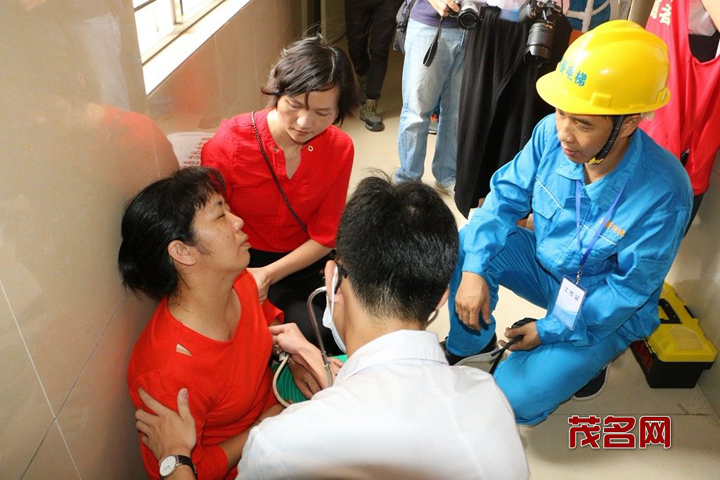 演练现场,一部正在运行的电梯突然发生故障,电梯内3名乘客被困,其中1名女乘客由于惊吓过度出现呼吸困难现象。电梯安全管理员在接到故障电话后,立即通知电梯维保单位赶赴现场,并对受困人员进行安慰。紧随其后救援人员赶到现场,通过排查电梯故障,最终打开电梯门救出被困人员。现场待命的医护人员随即对感觉不适的被困人员进行救治。之后,维修人员又再次检查电梯各项功能,确认安全后方恢复使用。