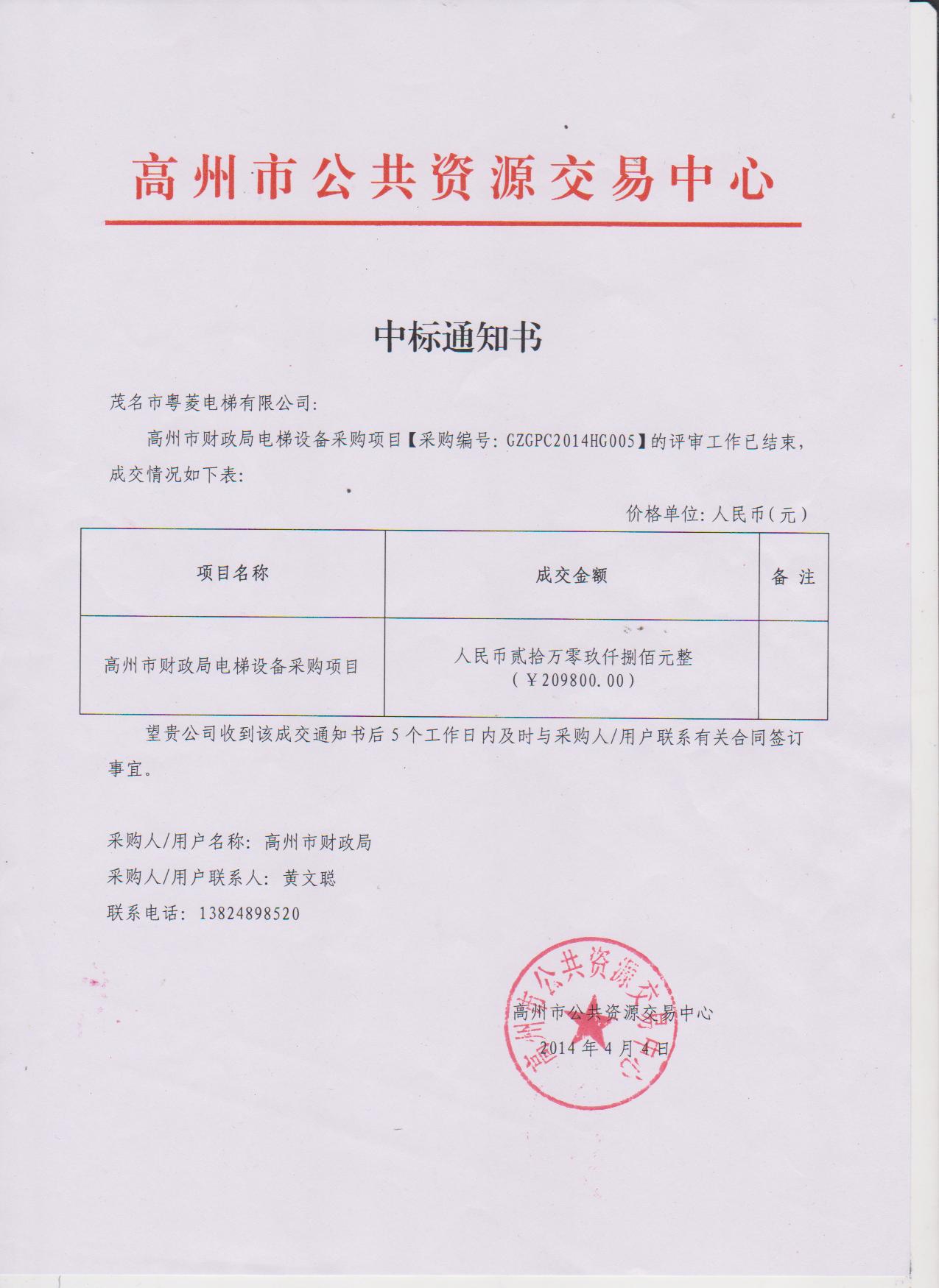 祝贺茂名市粤菱电梯有限公司中标高州财政局电梯设备采购招标项目