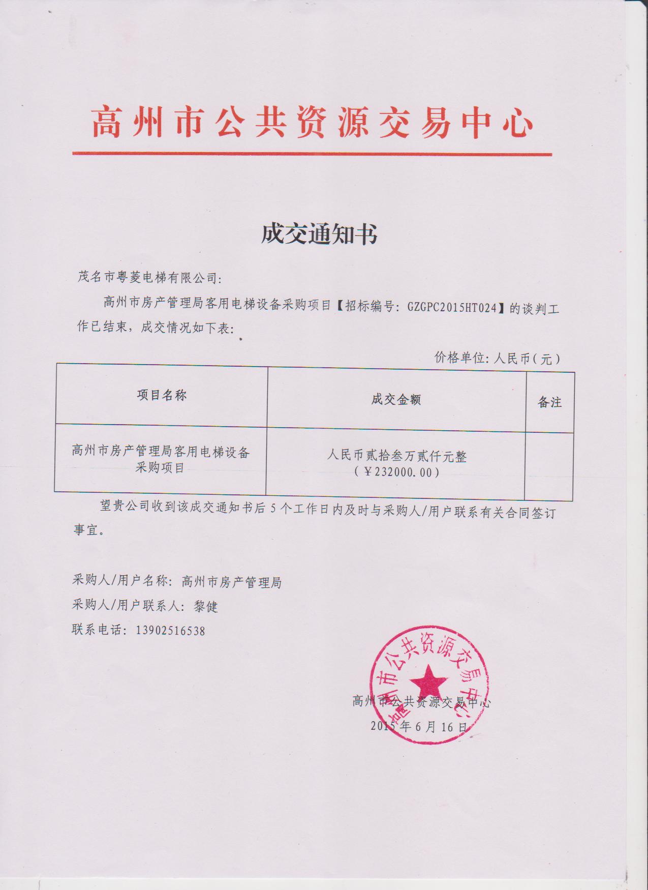 祝贺茂名市粤菱电梯有限公司中标高州房产管理局电梯设备采购招标项目