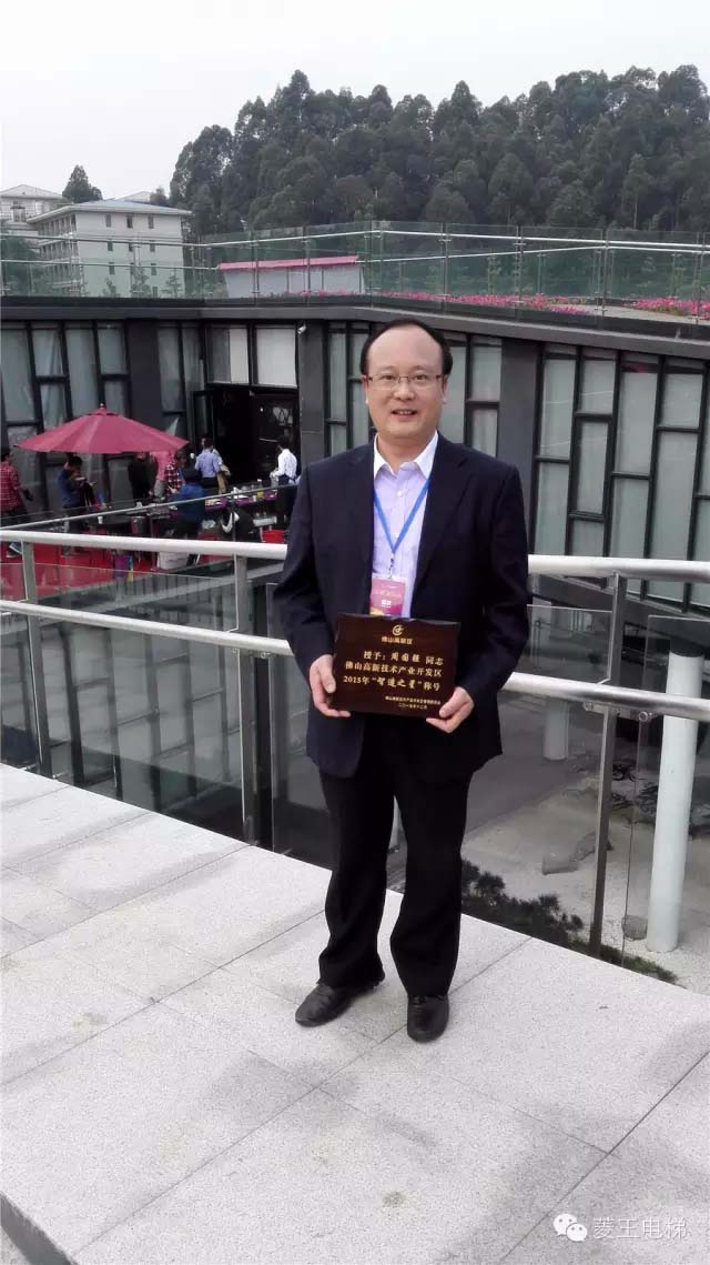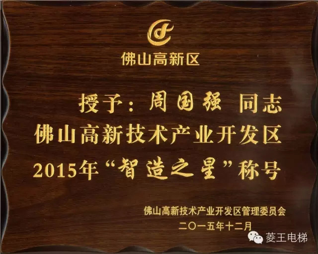 2015年12月1日,佛山高新技术产业开发区2015年“智造之星”评选颁奖典礼在佛山高新区工业设计展馆隆重举行,10名企业代表获评“智造之星”,菱王电梯股份有限公司研发部部长周国强同志喜获该项殊荣。