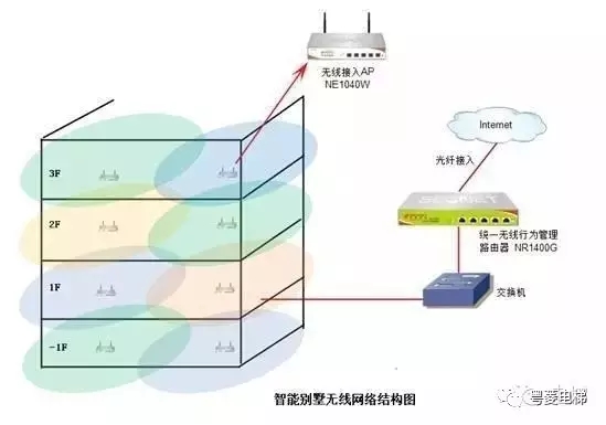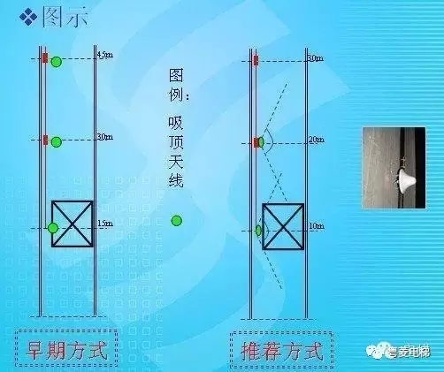 但这种方法有问题,第一是施工麻烦,第二是可能天线或者其他设备掉落,很有隐患,第三点是信号强度和电梯位置有关,当距离电梯较远的时候,接受信号可能会不理想,所以有人就提出这种方法,布置多个天线来解决这个问题: